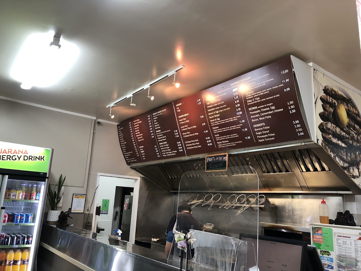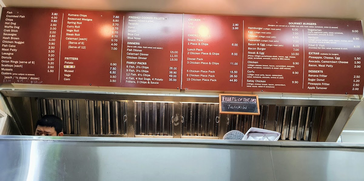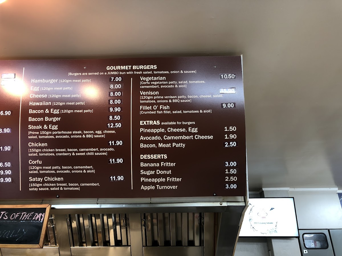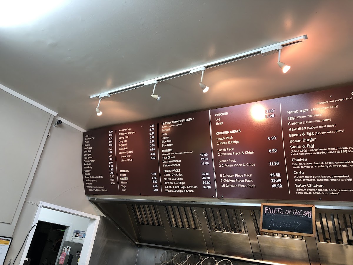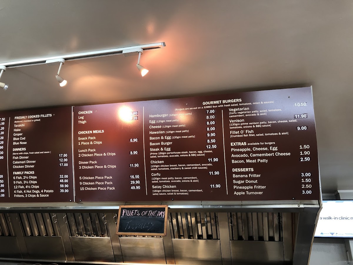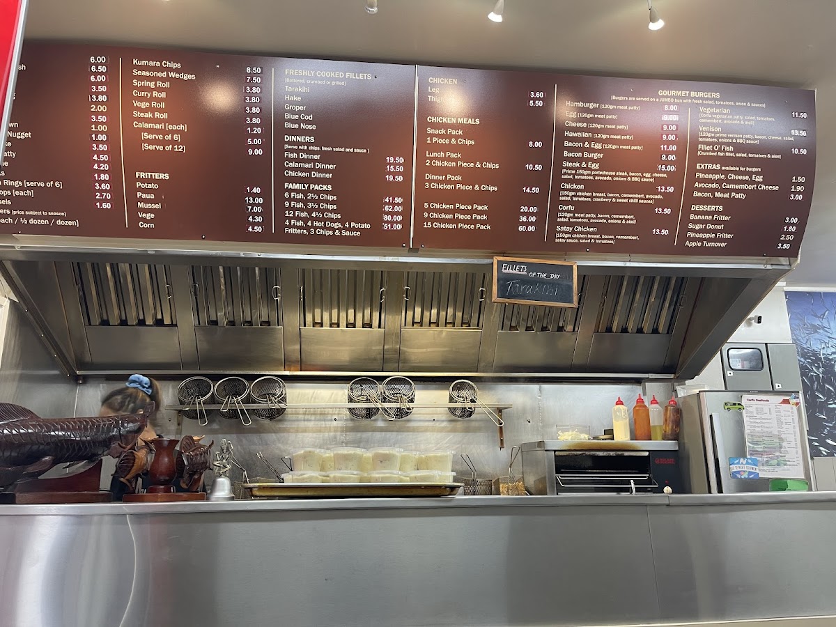 From a reviewer’s perspective, the menu at Corfu Seafoods offers a solid, no-frills selection that emphasizes variety and classic takeaway comfort. The Freshly Cooked Fillets stand out, with options like Tarakihi, Hake, Groper, Blue Cod, and Blue Nose, catering well to seafood lovers seeking freshness and choice. The Dinners section, including Fish Dinner, Calamari Dinner, and Chicken Dinner, provides satisfying, well-rounded meal options, while the Chicken Meals such as Snack Pack and Lunch Pack are convenient for lighter appetites. Their Gourmet Burgers-like the Vegetarian, Hamburger, Egg Cheese, and Hawaiian-add a hearty alternative, enhanced by extras like Pineapple, Avocado, and Bacon for customization. Sides and snacks are equally appealing, with Fritters such as Potato, Mussel, and Vege Corn, alongside indulgent Desserts like Banana Fritter, Sugar Donut, and Apple Turnover. The inclusion of combo-style offerings in the “Others” section-like 4 Fish, 4 Hot Dogs, 5 Chicken Piece Pack, and Fillet O' Fish Venison-makes it ideal for sharing or family meals. Overall, while pricing details are not highlighted, the breadth of dishes and familiar favorites make the menu approachable, filling, and dependable for a casual seafood takeaway experience.
